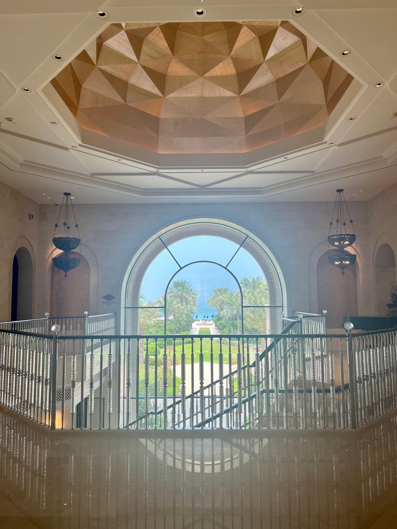À l'intérieur, le hall lumineux avec ses sols en marbre, ses plafonds dorés et ses mosaïques scintillantes, crée une ambiance raffinée et accueillante. Chaque détail, du mobilier moderne aux touches traditionnelles comme les lampes suspendues, contribue à un style résolument luxueux. On est captivé dès les premiers pas par une grande baie vitrée qui offre une vue panoramique sur les jardins soignés, la plage et la mer d'un bleu intense, ajoutant une touche de sérénité à ce cadre somptueux.