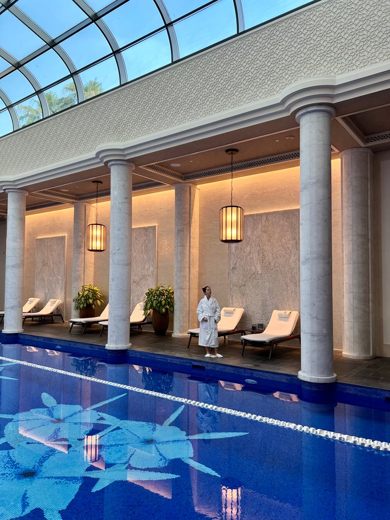 The Pearl Spa est un havre de paix où le raffinement se marie à l'héritage culturel des Émirats Arabes Unis. Avec ses 10 salles de soins élégamment aménagées et ses installations aqua-thermales séparées pour hommes et femmes, ce sanctuaire de bien-être offre une expérience de relaxation incomparable. Sa superbe piscine intérieure, baignée de lumière naturelle grâce à une magnifique coupole en verre, invite également à la sérénité. Inspiré par la tradition perlière de Dubaï, chaque soin incarne un lien intime avec le désert, l'oasis et la mer. Le spa propose une gamme de soins pour la peau et le corps, utilisant des ingrédients locaux comme le lait de chamelle, le miel, l'argile et les perles, tout en s'appuyant sur des marques renommées telles que Biologique Recherche, Sodashi et Dr. Burgener pour les soins du visage.