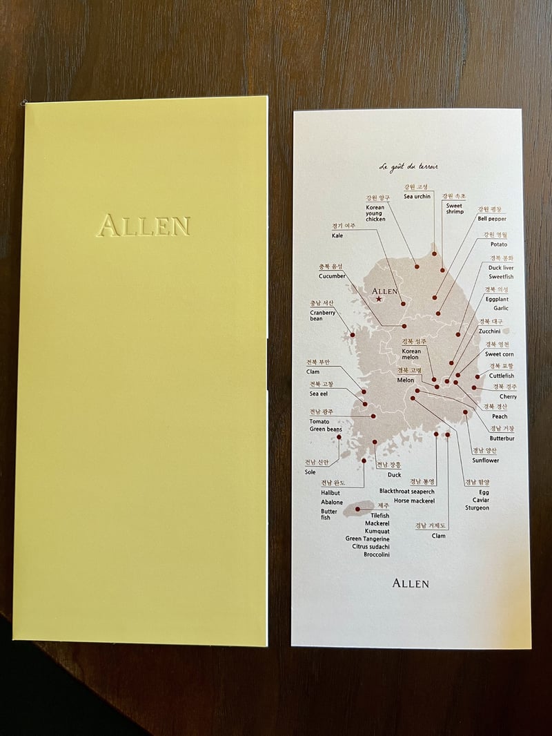 Le restaurant Allen incarne une vision singulière de la haute cuisine, où le Chef Allen Suh marie avec finesse la technicité de la gastronomie française et l'authenticité de la tradition coréenne. Chaque plat reflète une interprétation personnelle de l'héritage culinaire et culturel diversifié du chef, dans une salle à manger moderne sublimée par des touches traditionnelles. Le concept central de l'expérience est une célébration du « goût du terroir », une immersion sensorielle dans l'essence des ingrédients locaux et saisonniers.