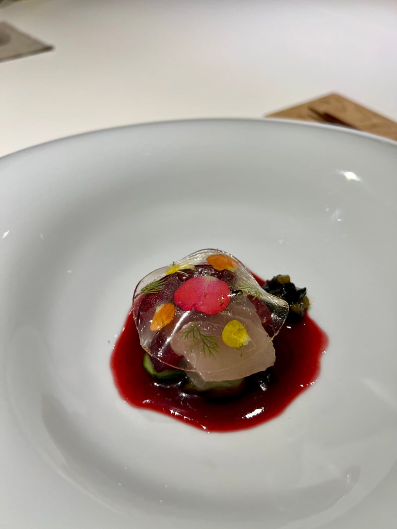 Le poisson fait ensuite son apparition avec un tilefish travaillé comme un fish & chips. La croûte dorée et croustillante révèle une chair de poisson fondante et délicate, tandis que la betterave qui l'accompagne offre un équilibre parfait entre sucré et salé, accentuant la richesse du plat tout en gardant une légèreté en bouche.