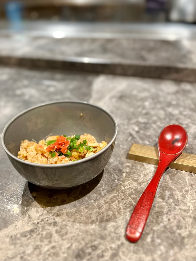 Puis vint l'okonomiyaki au homard canadien, un plat aussi spectaculaire visuellement que gustativement. Le homard, tendre et délicat, était sublimé par la texture moelleuse de la crêpe et le croquant des garnitures. Les feuilles d'or scintillantes ajoutaient une dimension luxueuse, rendant ce plat aussi mémorable pour les yeux que pour les papilles. Quant au riz frit au porc braisé, il offrait une note de confort et de convivialité. Les grains de riz légèrement croustillants se mariaient parfaitement avec les morceaux de porc tendre, lentement cuits jusqu'à une texture presque confite. C'était un plat généreux, apportant une conclusion réconfortante à la partie salée du repas.