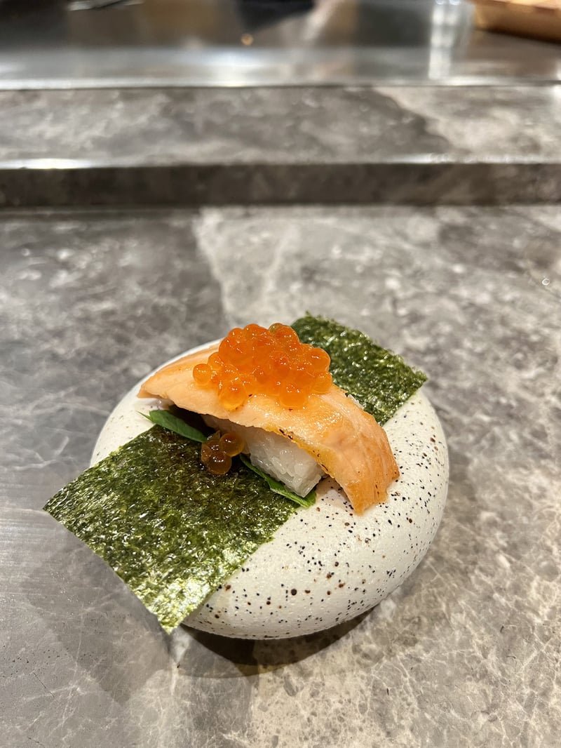 Le premier plat, un sushi de saumon grillé et ses œufs délicats, a immédiatement séduit par sa simplicité raffinée. La légère caramélisation du saumon offrait une texture fondante et un subtil goût fumé, tandis que les œufs de saumon éclataient en bouche pour une explosion de saveurs marines. Ensuite, le rouleau de langue de bœuf, façon baguette, apportait une touche de contraste audacieuse avec un clin d'œil à la street food japonaise. Enveloppée dans une fine couche croustillante, la langue de bœuf, tendre et savoureuse, révélait un cœur fondant qui combinait merveilleusement tradition et modernité. C'était un plat à la fois ludique et profondément satisfaisant.