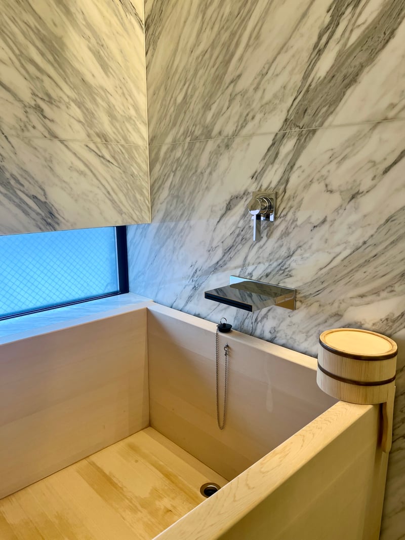 Les salles de bain sont une expérience en elles-mêmes, avec leur luxueux marbre pastel dans des tons délicats de rose, vert ou beige. Elles sont équipées de baignoires en bois de hinoki, dont le parfum naturel offre un moment de relaxation unique. Des accessoires soigneusement sélectionnés, tels que les boîtes en bambou de style bento fabriquées par les artisans de Kyoto, ajoutent une touche d'authenticité et de raffinement.
