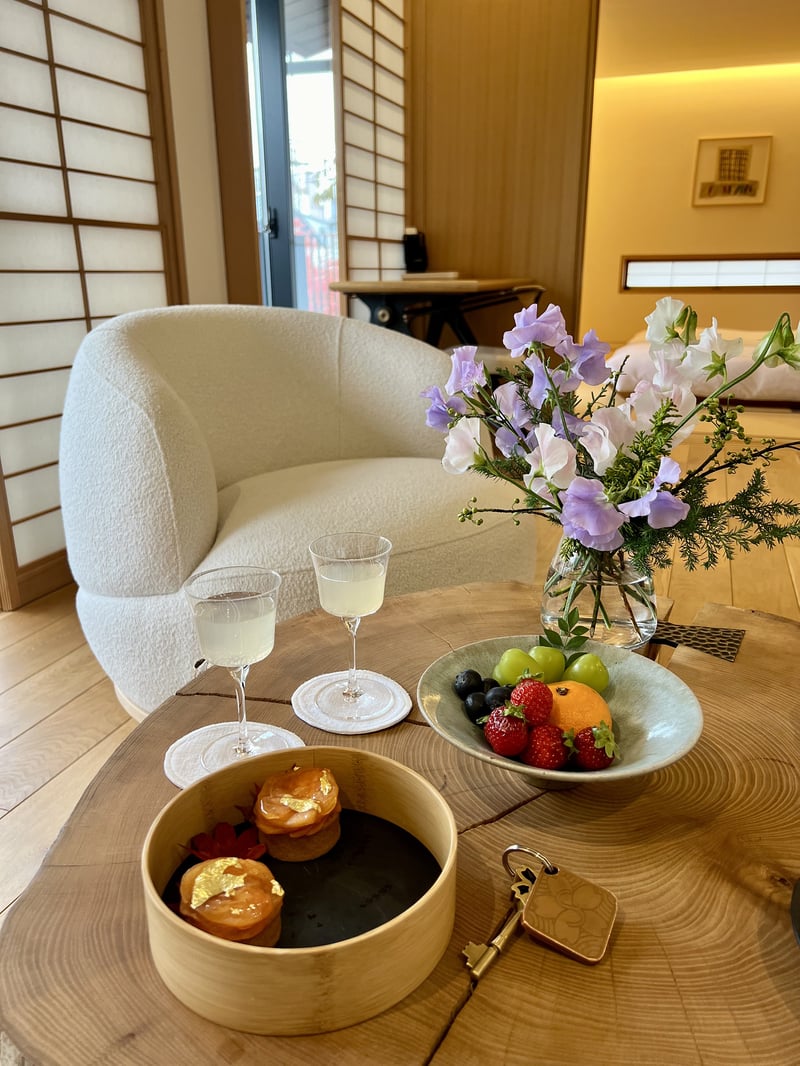 Chaque suite reflète l'artisanat de Kyoto à travers des détails d'exception : têtes de lit en sycomore naturel, tables en bois brut réalisées par le maître ébéniste Paul Longpré, et céramiques uniques de Takayuki Watanabe. Ces touches artisanales sont sublimées par des œuvres d'art modernes d'artistes renommés tels qu'Annie Morris, Mary McCartney, et Richard Gorman. Les suites rendent également hommage à la beauté élémentaire de la nature, avec des matériaux nobles comme le bambou, la soie, le marbre et la laque, incorporés dans chaque détail.