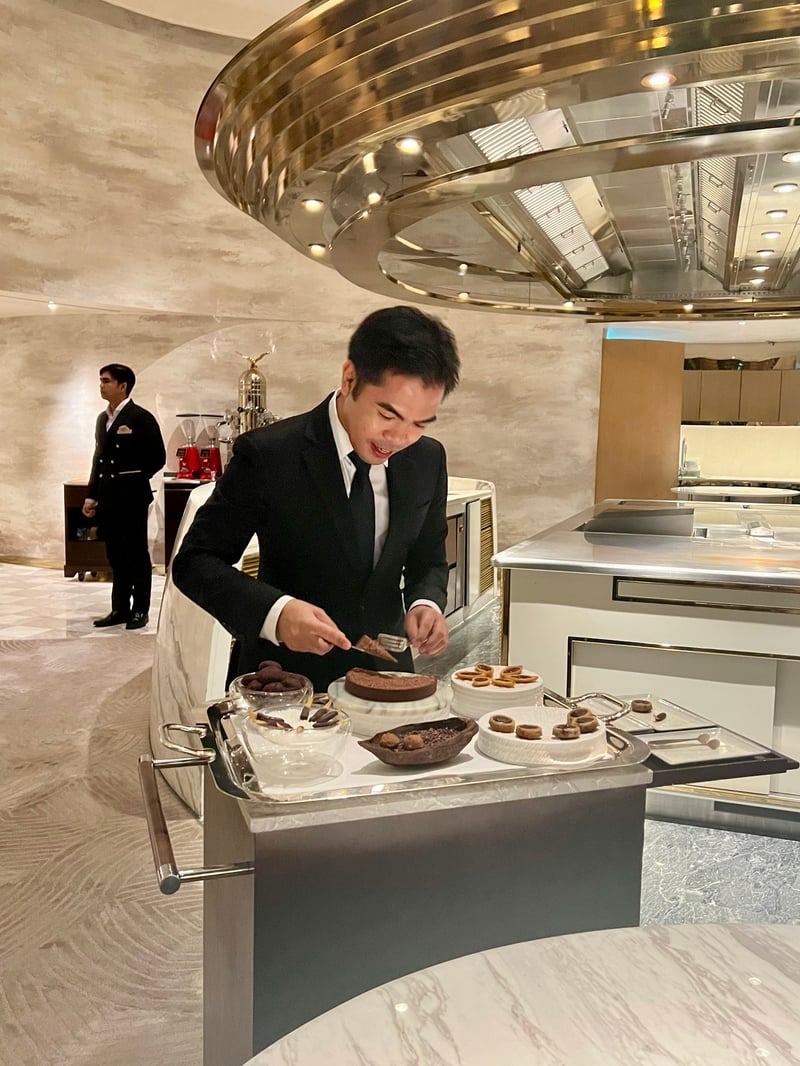 Au cœur du restaurant trône une cuisinière Molteni couleur crème et laiton, enchâssée dans un somptueux marbre de Carrare. Cette pièce maîtresse, à la fois symbole d'excellence et d'élégance, s'entoure d'une hotte en acier plaqué laiton, dont les anneaux évoquent un monument bouddhiste, un hommage à l'artisanat thaïlandais. La cuisine, entièrement ouverte et installée au centre de la salle, se transforme en véritable théâtre gastronomique où chaque geste des chefs devient un spectacle. Cette conception audacieuse, qui dépasse l'idée traditionnelle d'une cuisine ouverte, permet aux convives d'être pleinement immergés dans le processus culinaire. Face à cet espace central, un second comptoir est dédié à l'art de la pâtisserie, ajoutant une touche finale à cette expérience sensorielle d'exception.