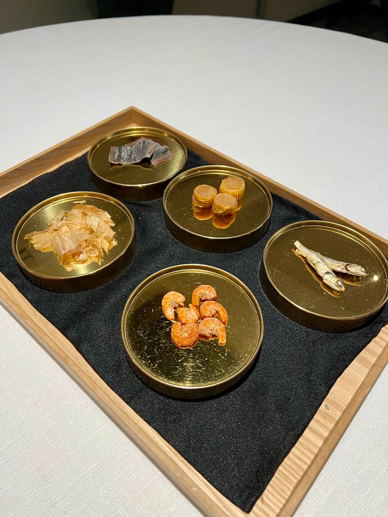 Ce dîner en 12 plats fut une véritable célébration des saveurs, un voyage sensoriel où chaque assiette racontait une histoire unique, entre délicatesse et créativité. Dès les premières bouchées, la soupe au sésame et au poulpe a enveloppé le palais d'une douceur umami, sa texture soyeuse contrastant avec la tendreté du poulpe. Le chutoro et avocat ont ensuite offert un mariage de textures et de saveurs, où la richesse du thon fondant se mêlait à la douceur crémeuse de l'avocat. Un bouillon aux notes acidulées relevait le tout, tandis que les feuilles de kinome apportaient une touche aromatique poivrée.. Le sand whiting fish, frit à la perfection, était une belle découverte. Ce poisson Pla Sai, mariné à l'ume avant d'être enveloppé dans des feuilles de périlla coréenne, dévoilait une chair tendre sous une enveloppe croustillante. Servi avec des feuilles de périlla fraîches, du bilimbi et une sauce à la prune salée, il conjuguait finesse et contrastes harmonieux.