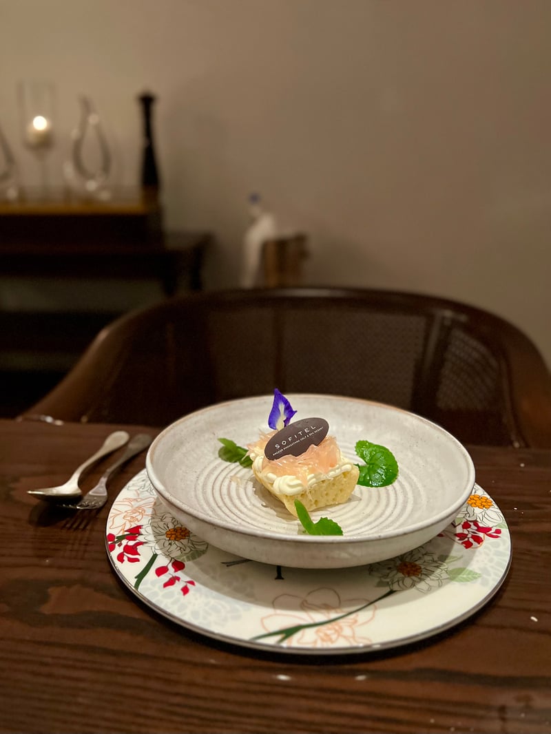 Le repas se conclut sur une note légère et florale avec un baba au rhum revisité. Posé sur un biscuit moelleux délicatement imbibé, une rosace de crème aérienne accueille de fins segments de pomelo rose, dont l'acidité rafraîchissante équilibre parfaitement la douceur du dessert. Quelques feuilles de menthe et une fleur comestible complètent ce tableau délicat, couronné par un fin disque de chocolat siglé « Sofitel ». Une fin de repas tout en grâce, à la hauteur de ce dîner d'exception.