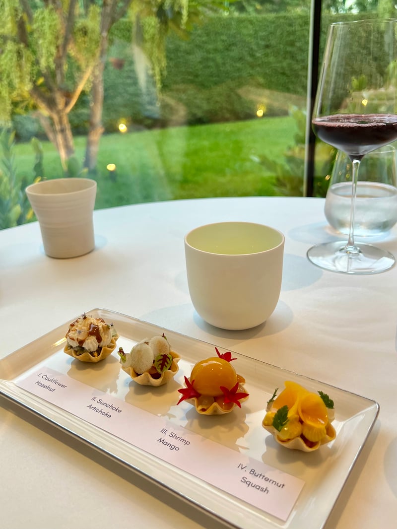 Dans un cadre verdoyant et raffiné, les amuses-bouches ouvrent le bal de ce dîner gastronomique en 6 services avec quatre délicates bouchées, servies dans de petites tartelettes ondulées : une crème de chou-fleur aux noisettes croquantes, une alliance subtile de topinambour et d'artichaut, une demi-sphère de mangue sur crevette, et de fins rubans de courge butternut. En guise de clin d'œil poétique, une coquille Saint-Jacques posée sur des cailloux blancs dévoile une perle nacrée entourée de meringue, crème, fleurs et herbes fines – une bouchée surprise d'une esthétique parfaite.