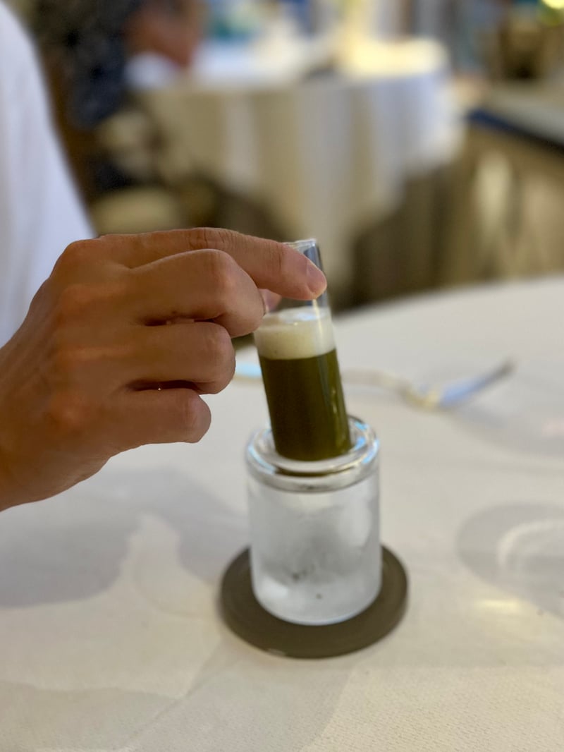 Pour apporter une note inattendue, un shooter de pression glacée d'absinthe des Alpes de Haute Provence vient surprendre et réveiller les papilles. Servi dans un élégant verre givré, ce shot révèle la puissance aromatique de l'absinthe sublimée par la fraîcheur extrême de la préparation glacée, offrant un interlude vivifiant et audacieux. La suite nous emmène vers un plat de caractère : le gigot d'agneau des Alpilles cuit dans son sable chaud de garrigue aride. La cuisson lente dans le sable imprègne la viande des arômes subtils des herbes sauvages, révélant une chair tendre et savoureuse. Le jus corsé intensifie la richesse du plat, tandis que la fricassée de petit épeautre et de pois cassés apporte une touche rustique et authentique.