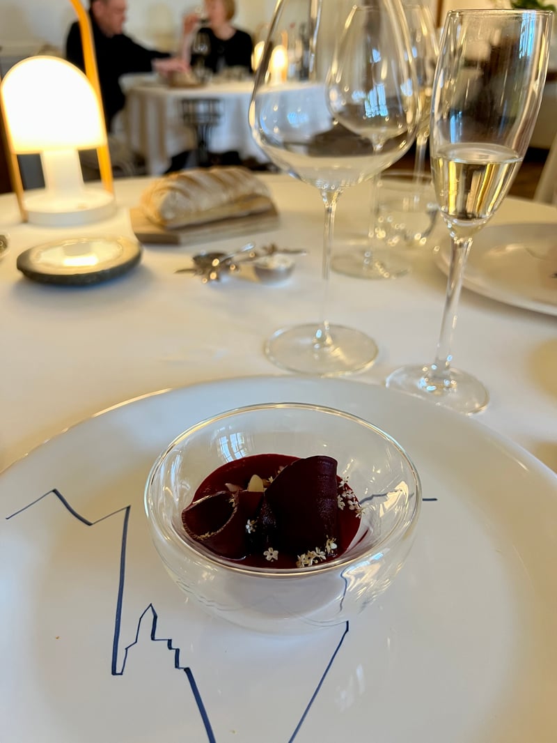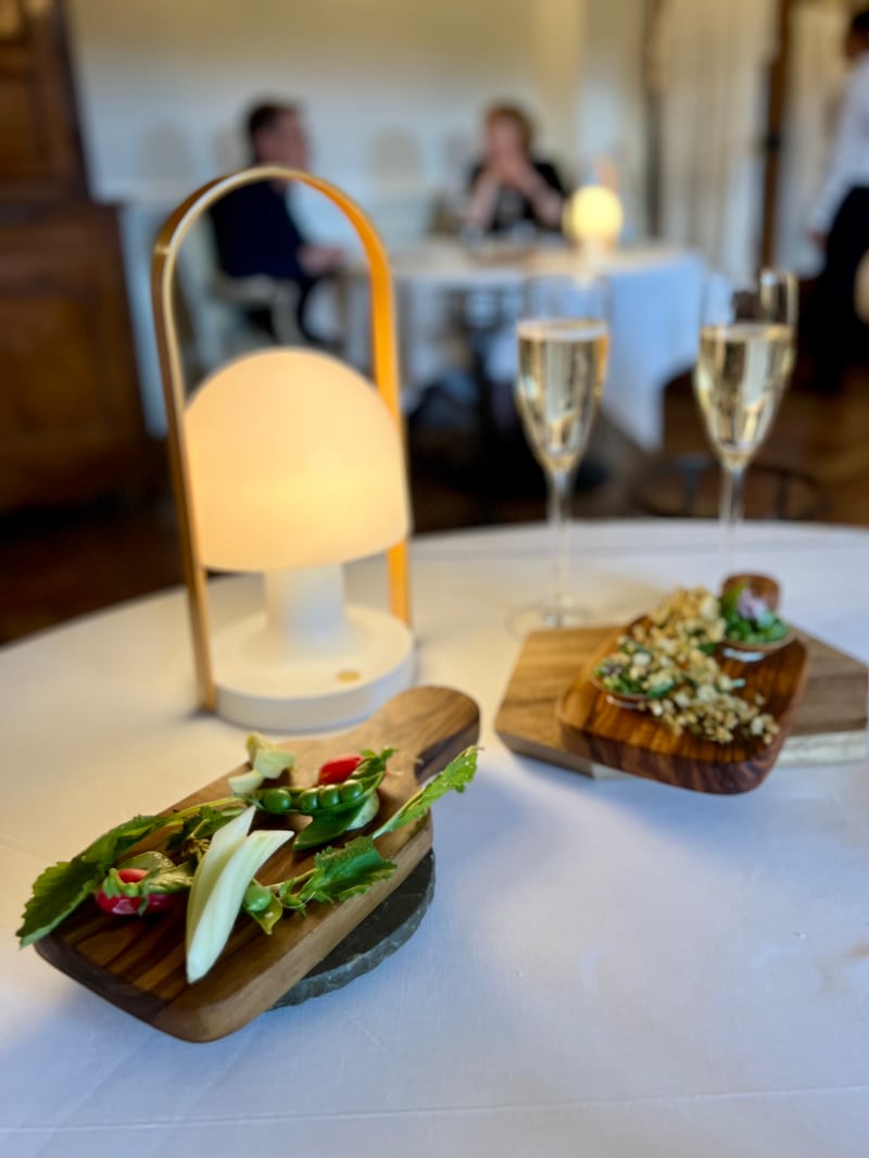 Notre dîner étoilé à La Bastide de Moustiers fut une véritable immersion dans la philosophie culinaire du lieu. Le repas s'ouvrit sur un rouget mariné, accompagné d'une pomme de terre safranée, de petits pois croquants et de fleurs de sureau, le tout relevé par un bouillon délicat de poisson de roche, clair et intensément parfumé. Suivait une assiette végétale tout en finesse : les gnocchi dorés sont nappés d'un jus de cuisson riche et savoureux avec des éclats d'artichauts du potager, tendres mais encore légèrement croquants, qui apportent une belle texture. Une feuille de chou kale rôtie vient coiffer l'ensemble, ajoutant une touche de vert vif et de croustillant.