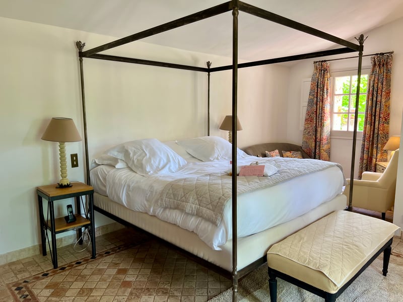 Nous avons séjourné dans la chambre Volière, un véritable cocon niché dans un petit pavillon indépendant, accolé au bâtiment principal. Cette chambre Deluxe de 35 m² séduit par son atmosphère paisible et chaleureuse, servie par une belle palette de tons naturels, entre ocres et écrus. Le sol en carreaux provençaux et le lit en baldaquin en métal apportent une touche authentique et romantique. La pièce s'ouvre sur une terrasse privative donnant directement sur le parc, idéale pour profiter du calme et des senteurs du jardin. La salle de bains est équipée d'une baignoire à l'ancienne et baignée de lumière naturelle.