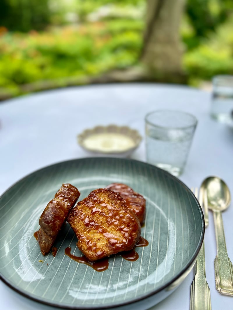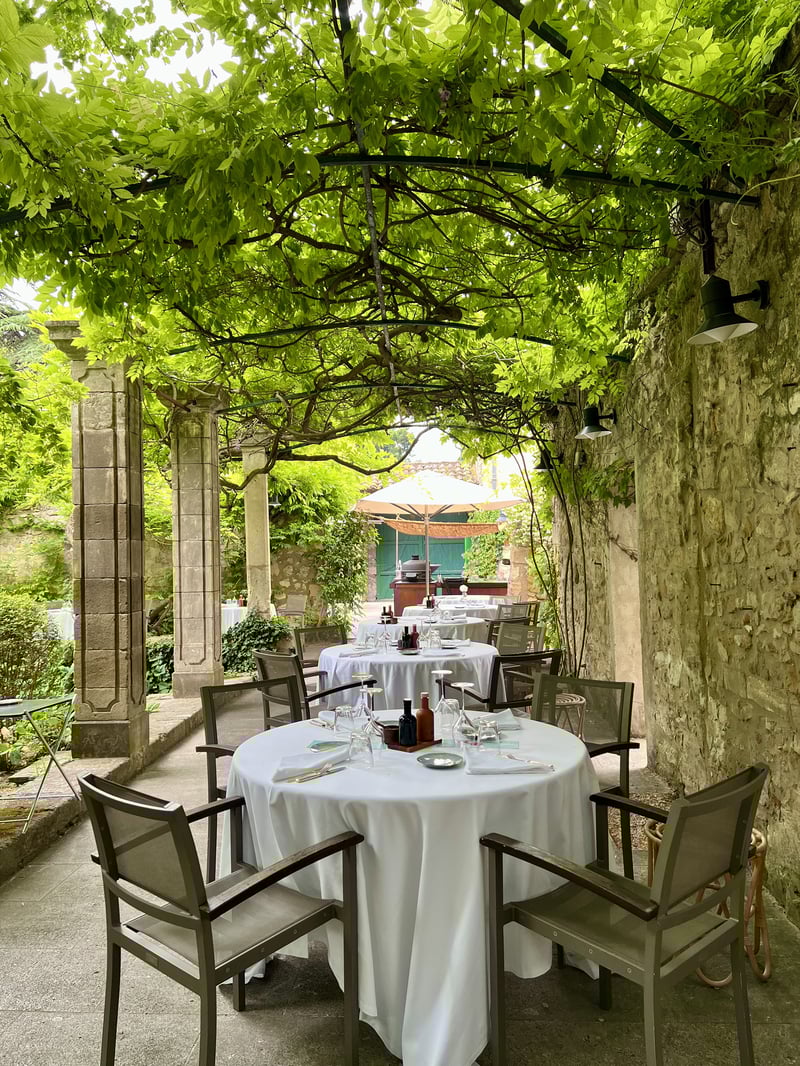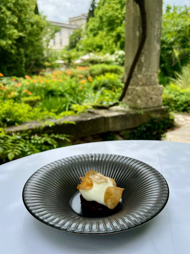 Confortablement attablés sous une tonnelle couverte de jasmin et de glycines, avec vue sur le potager biologique, notre déjeuner à La Petite Table du Prieuré fut un moment de grande gourmandise, où la simplicité apparente cache une vraie maîtrise des produits et des saveurs. En entrée, le sébaste rose, préparé façon gravlax, s'accompagne de mangue et d'un mélange herbacé qui apporte fraîcheur, douceur et vivacité — une introduction aussi élégante que subtile. L'huître n°0, servie chaude après un passage au barbecue, surprend agréablement : son alliance audacieuse avec l'os à moelle rôti et le jambon ibérique offre une profondeur de goût inattendue, entre iode, fumé et rondeur.