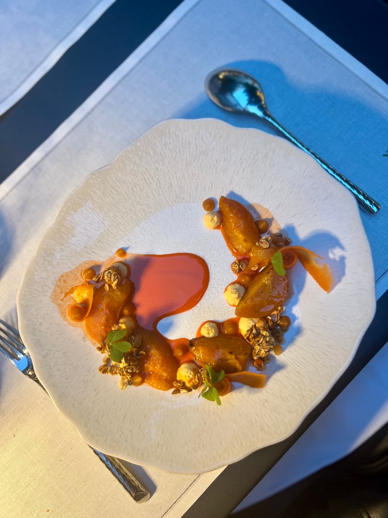 Enfin, pour conclure ce repas tout en légèreté et en finesse, mon mari s'est laissé tenter par le baba à l'Italicus, une liqueur florale et citronnée. Le gâteau, moelleux à souhait, reposait sur une crème à la verveine, tandis que quelques dés de pêche blanche et des éclats d'amandes complétaient ce dessert d'une grande fraîcheur. Quant à moi, j'ai craqué pour une création autour de l'abricot, poché à la carotte puis fumé au barbecue. Accompagné d'une crème d'abricot onctueuse, d'un jus de carotte corsé à la vanille de Madagascar, de granola et de noisettes croquantes, ce dessert végétal et fruité offrait une belle profondeur aromatique. Une finale audacieuse, à l'image de ce dîner aussi précis qu'inspiré.