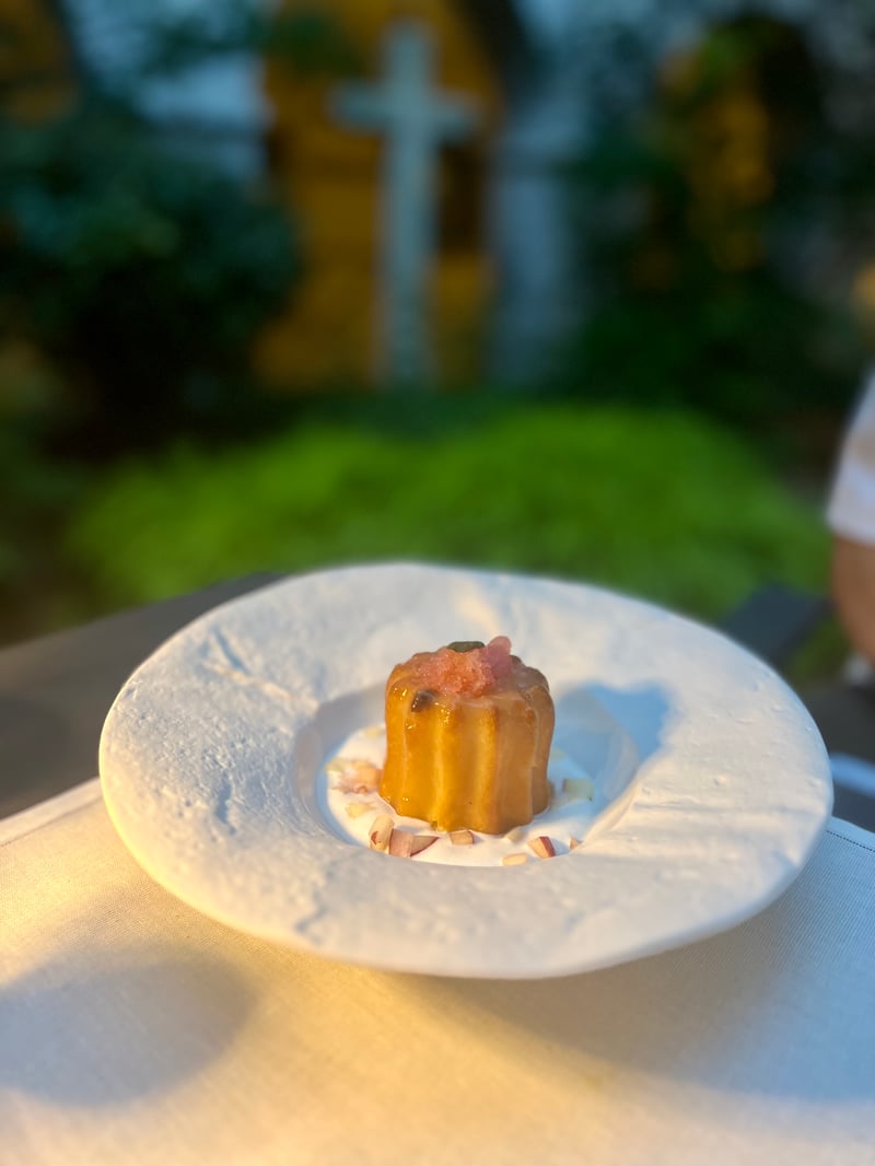 Bien que les menus aient été très alléchants, nous avons préféré opter pour une sélection à la carte, guidés par nos envies du moment. Installés dans le cadre enchanteur du jardin du restaurant, sous les arches élégantes du Grand Hôtel-Dieu et bercés par une lumière tamisée, nous avons ouvert le dîner avec une coupe de champagne — un prélude pétillant à cette parenthèse gastronomique.
