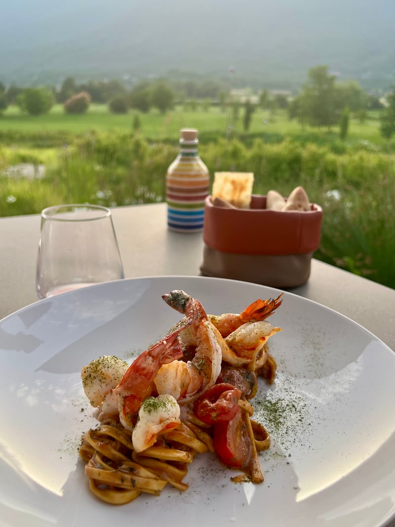 La suite du repas nous a conduits vers deux plats généreux, chacun ancré dans sa région d'inspiration. Gamberoni, tout droit venu de Sicile, proposait des tagliatelles fraîches nappées d'une bisque de gambas riche et parfumée à l'estragon. Surmontées de gambas rôties et de tomates cerises fondantes, les pâtes dévoilaient un savant jeu de textures et une intensité aromatique maîtrisée, rehaussée par des zestes de citron qui venaient illuminer l'ensemble.