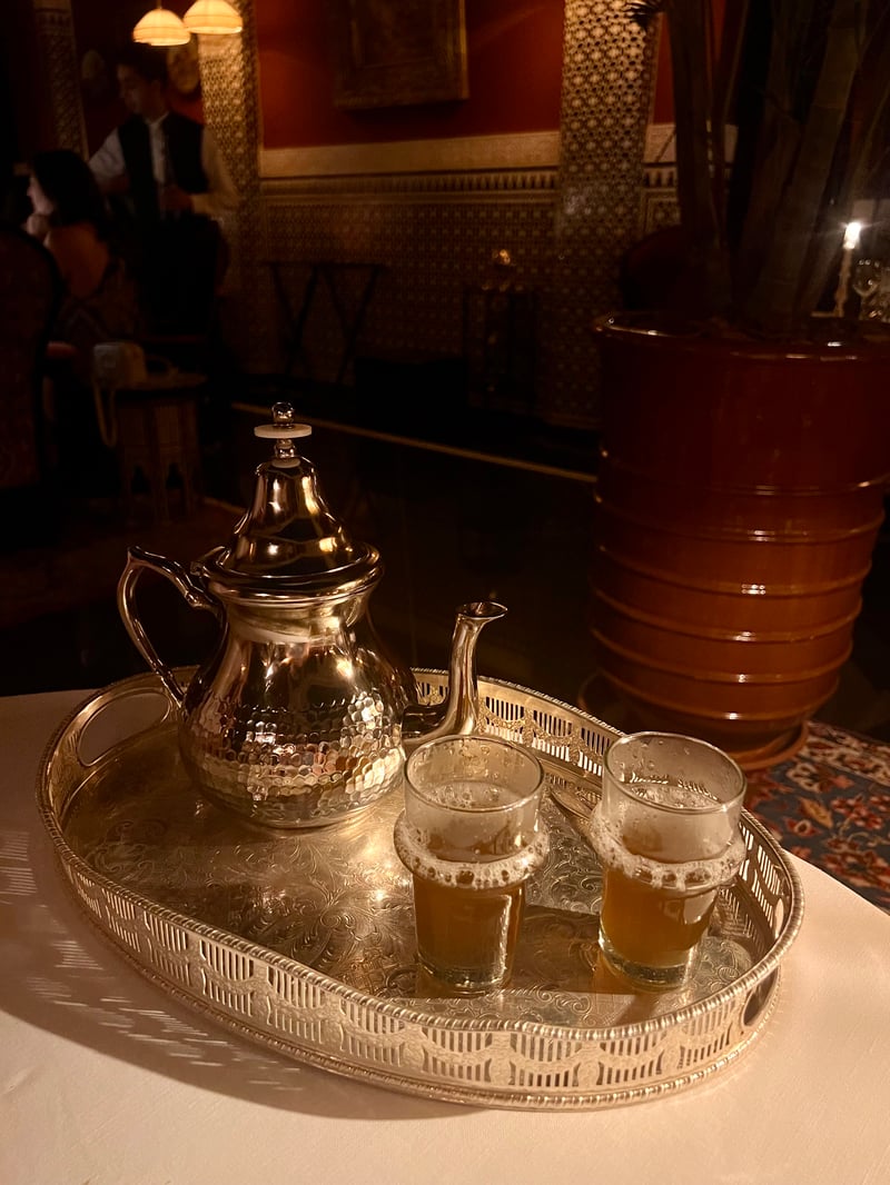 Enfin, les desserts ont apporté une touche finale tout en équilibre entre légèreté et gourmandise. Le millefeuille à la gousse de vanille, aérien et croustillant, jouait sur l'alternance des textures et la douceur parfumée de sa crème, pour une interprétation délicate d'un grand classique. Le petit chou givré, revisitant l'esprit du Paris-Brest, associait quant à lui le croustillant d'un chou doré à la fraîcheur d'une crème glacée, le tout sublimé par un chocolat chaud onctueux versé à table. Entre fraîcheur et chaleur, croquant et fondant, ce dessert généreux et élégant clôturait en beauté une expérience culinaire d'une grande finesse. Et, comme il se doit à Marrakech, le dîner s'est terminé par l'incontournable thé à la menthe.