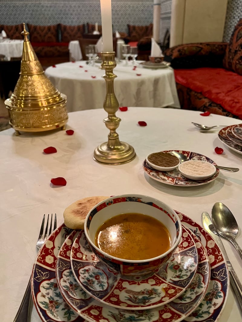 Mais c'est au dîner que l'art culinaire du Riad Kniza déploie toute sa magie. Réputée pour sa cuisine familiale authentique, transmise de génération en génération, la maison convie ses hôtes à un véritable voyage gustatif. Installés dans l'une des élégantes salles à manger, nous avons dégusté un menu en plusieurs services, conçu comme une célébration raffinée des traditions marocaines. L'atmosphère, déjà intime et chaleureuse, a été magnifiée par la musique envoûtante des musiciens gnawa, dont les chants et rythmes ont accompagné chaque plat, ajoutant une dimension poétique et intemporelle à ce moment unique.