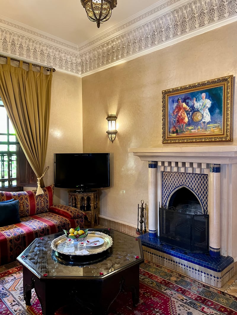 Lors de notre séjour, nous avons eu le privilège de découvrir la Kenza Senior Suite, un véritable écrin de confort et de charme. Située au deuxième étage, elle se distingue par son spacieux salon indépendant, orné de banquettes traditionnelles aux étoffes chatoyantes et réchauffé par une cheminée en zellige bleu. Les murs aux tons sable, soulignés de stucs sculptés, accueillent des œuvres d'art colorées qui insufflent à l'ensemble une touche contemporaine. De grandes fenêtres habillées de lourds rideaux dorés filtrent une lumière douce, créant une atmosphère à la fois intime et raffinée. La chambre, quant à elle, met en valeur un lit king-size habillé de textiles aux teintes profondes de rouge et de pourpre. Les lampes marocaines ajourées diffusent une lumière tamisée qui sublime la chaleur des matières et des couleurs. Avec sa salle de bains privative et ses 50 m² pensés pour le confort, cette suite offre l'expérience d'un véritable appartement raffiné, idéal pour goûter à la fois au luxe et à l'authenticité de l'art de vivre marocain.