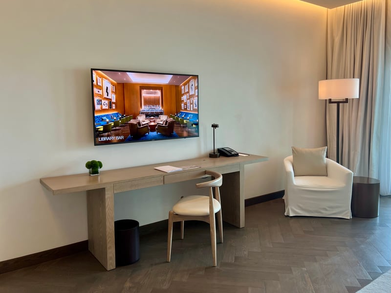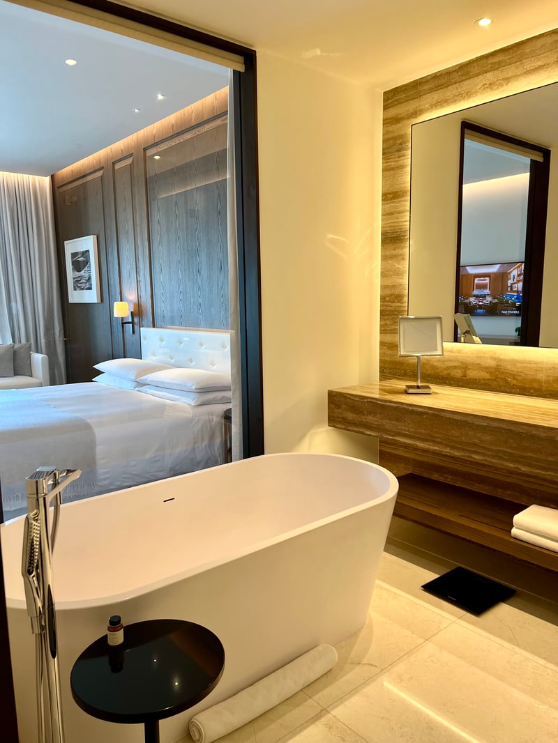 Nous avons séjourné dans une Deluxe Marina Room de 49 m², pensée comme un refuge élégant face à la mer. Sa grande baie vitrée offrait un panorama splendide sur la marina, visible également depuis une terrasse privée aménagée avec goût. L'intérieur se distinguait par une atmosphère sereine, dominée par des nuances de beige et de bois clair. Le lit king-size, d'un confort remarquable, côtoyait une méridienne invitant à la détente et un bureau minimaliste idéal pour écrire ou simplement contempler la vue. La salle de bain, lumineuse et généreuse, mêlait marbre, laiton et lignes fluides, et proposait à la fois une baignoire profonde et une douche à effet pluie.