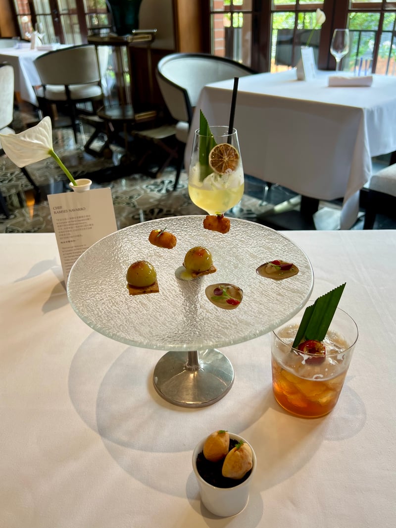 Les mises en bouche arrivent en une série de petites bouchées délicates : tout est pensé pour éveiller la bouche avec tact, sans imposer de puissance trop tôt. Côté mocktails, le Candied Hawthorn choisi par mon mari joue sur une fraîcheur vive d'agrumes et d'aubépine, relevée d'une pointe de cold brew qui apporte une amertume élégante. Le Getting Better que j'ai choisi est plus solaire et parfumé, mêlant ananas, fruit de la passion et coco, allongé d'un trait de citron et de soda qui apporte une dernière note pétillante.