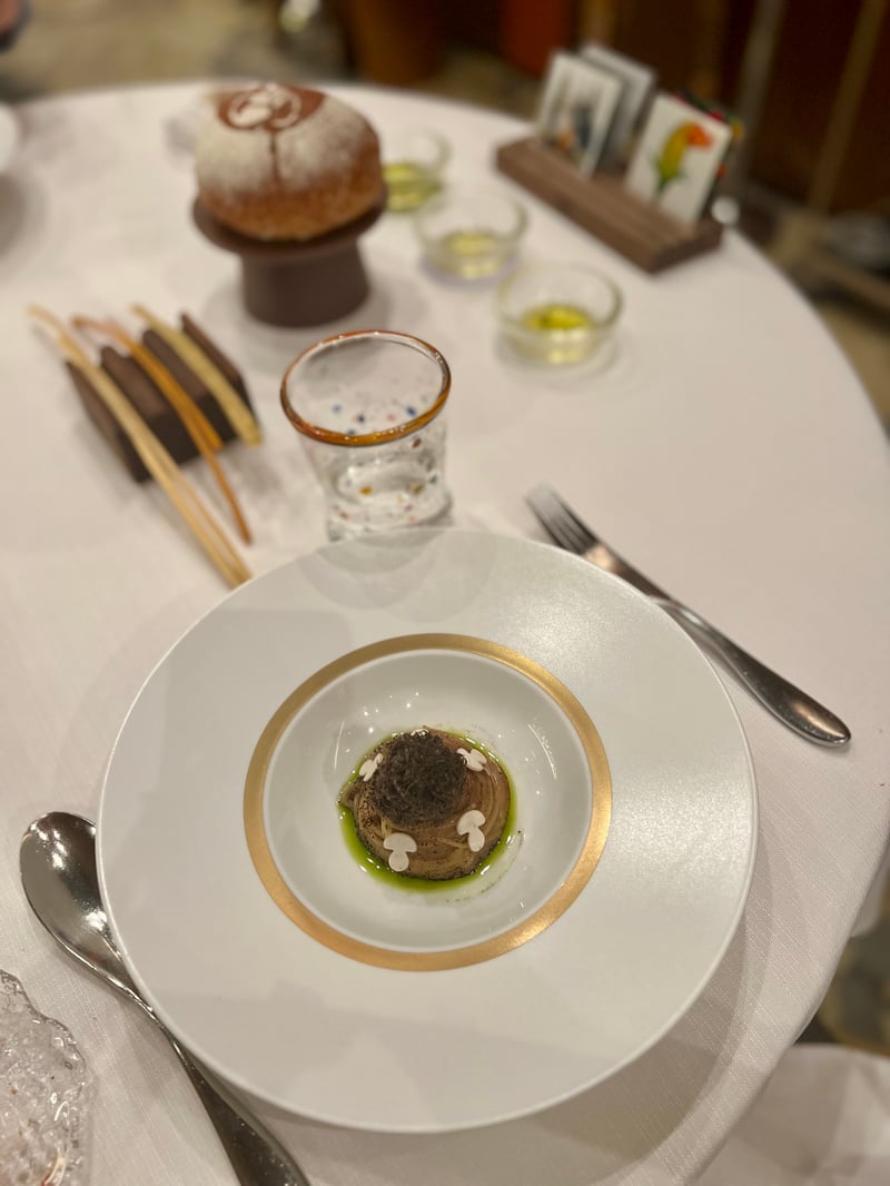 Puis venait un plat évoquant la forêt : présenté comme une petite souche d'arbre posée sur un lit de mousse et de pommes de pin. Le thon rouge, finement taillé en tartare, était pressé entre deux disques croustillants aux cèpes fermentés, apportant des notes umami et boisées. La texture alternait ainsi le croquant du cèpe et la douceur fondante du thon. Une crème légèrement acidulée venait assouplir l'ensemble, tandis qu'un zeste de yuzu rosso ajoutait une fraîcheur vive, presque aromatique. Terre et mer se répondaient ici avec une grande justesse.