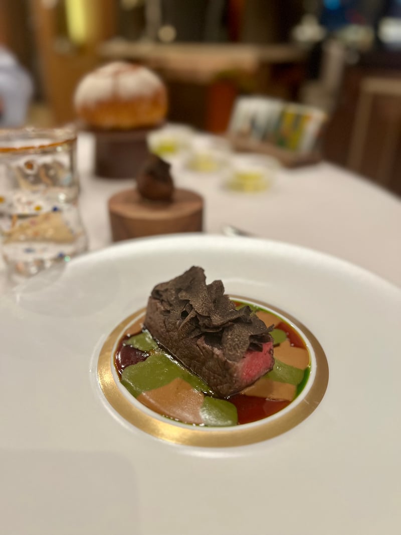 Le filet de wagyu australien arrivait ensuite, cuit avec une délicate note fumée de charbon. Sa texture tendre et juteuse était relevée par de larges lamelles de truffe noire. Autour, des sauces aux cèpes, au persil et au jus réduit formaient un motif graphique évoquant des rizières vues du ciel : une composition de couleurs et de profondeurs aromatiques. À côté, une boule de cèpe travaillée renforçait le lien avec la forêt.