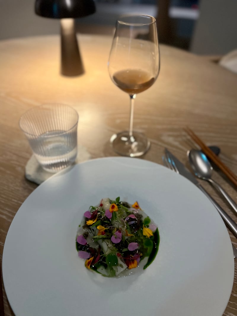 Nous avons opté pour le menu unique, dont le déroulé nous a été proposé après un moment d’attente ponctué par une coupe de 1688 Grand Blanc, un effervescent sans alcool élaboré en France à partir de vin désalcoolisé. Élégant, vif et délicatement fruité, il s’est révélé un excellent prélude au dîner, accompagnant avec la finesse d’un grand vin les premières notes du repas — sans une goutte d’alcool.