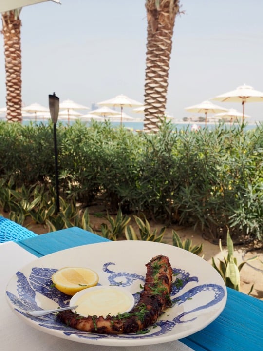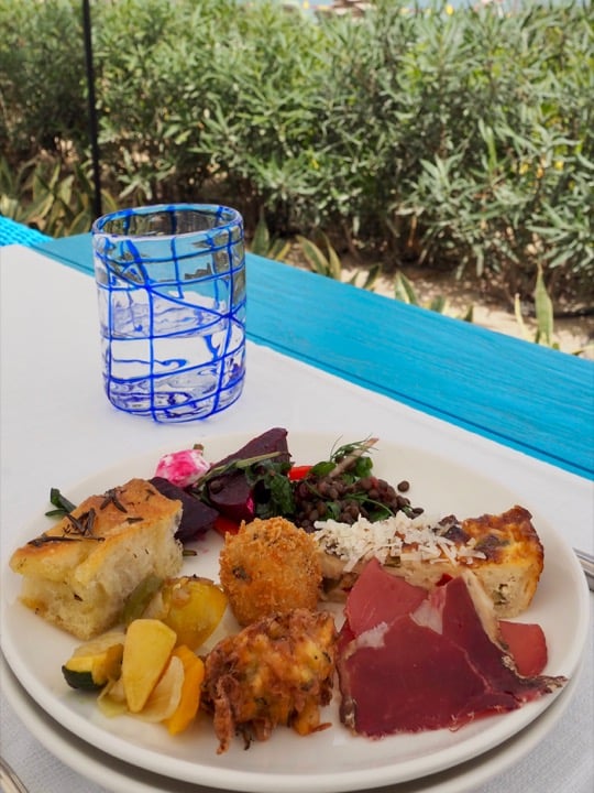 A l'heure du déjeuner, Villamoré est le spot parfait : dans cette ambiance relax avec un mobilier rustique chic dans les tons bleu et blanc, c'est une cuisine d'inspiration méditerranéenne que l'on retrouve dans les assiettes. Nous avons pu déjeuner au soleil face à la plage, en commençant avec un buffet d'antipasti qui est un régal pour les yeux comme pour les papilles.