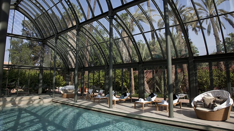 Imaginé par le roi Mohammed VI, ce palais-hôtel compose une médina privée de 53 riads sur trois niveaux—lustres Baccarat, plafonds en cèdre sculpté, tapis de soie tissés à la main—nichés dans un jardin de trois hectares signé Luis Vallejo. Des galeries souterraines assurent la discrétion absolue du service ; en surface, Hélène Darroze dirige les tables française et marocaine, Massimiliano Alajmo l'italien Sesamo. Le spa de 2 500 m², œuvre de plus de 1 200 artisans, déploie deux hammams et quarante variétés de marbre.