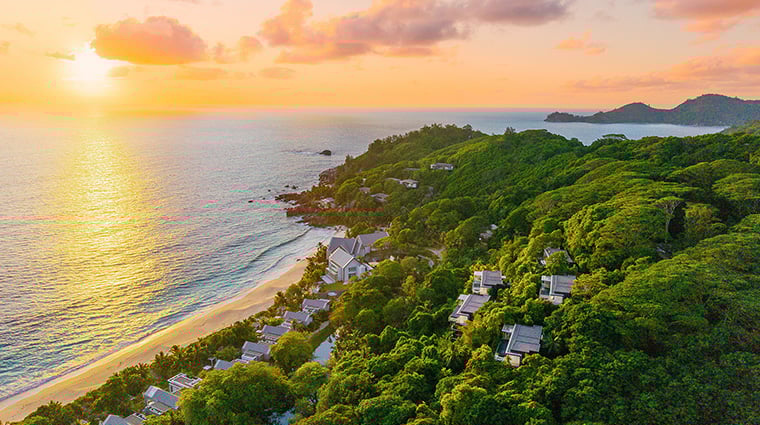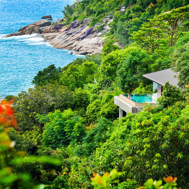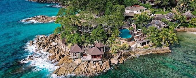 Sur un promontoire granitique dominant la plage d'Anse Louis, les trente villas signées Bill Bensley s'étagent parmi une végétation luxuriante sur douze hectares. Depuis les terrasses privées, le regard embrasse criques turquoise et sable blanc. Un majordome veille jour et nuit ; le spa balinais, avec ses pavillons à ciel ouvert, propose des soins singuliers. L'adresse séduit les couples en quête d'intimité comme les familles.