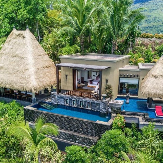 Soixante-sept villas perchées à flanc de colline dominent la baie de Petite Anse, chacune dotée d'une piscine privée et d'une terrasse en bois précieux face à l'océan Indien. Les intérieurs d'inspiration coloniale française côtoient douches tropicales et baignoires profondes. Au sommet, Le Syel Spa propose des rituels à base de noix de coco. Tortues géantes dans les jardins et piscine enfantine séduisent autant les couples que les familles.