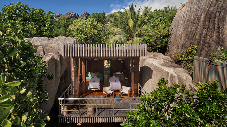 Sur l'île Félicité, cinq pavillons de soins surgissent entre d'immenses rochers de granit, reliés par des ponts suspendus épousant le relief sauvage. Les cabines se posent sur la roche, s'y glissent ou flottent au-dessus de l'océan Indien, presque invisibles dans la végétation. Une piscine d'eau salée à débordement domine la mer depuis les hauteurs, tandis que le rituel Couples Journey entrelace gommage à la myrrhe, masques africains, cristaux et bain aromatique.