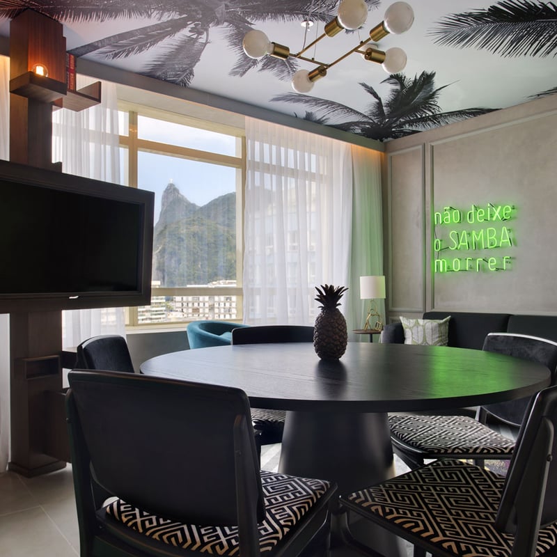 Le premier hôtel signé Yoo Design Studio affiche un parti pris graphique audacieux : fresques murales d'artistes de rue, imprimés colorés, ambiance résolument contemporaine. Le chef Marcelo Schambeck orchestre le restaurant Cariocally, cuisine carioca classique et fruits de mer locaux, tandis que le bar panoramique en rooftop propose des tapas face au Pain de Sucre et au Corcovado. Les chambres arborent des plafonds ornés de palmiers et de larges baies vitrées ; les suites thématiques offrent un supplément de style et de vue.