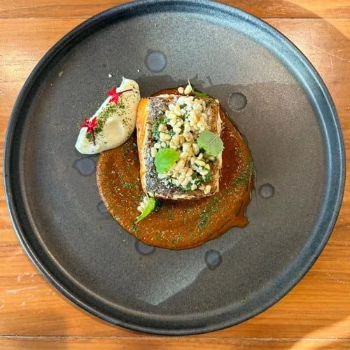 Perché à l'étage avec vue sur le littoral de Puerto Morelos, ce restaurant au toit de palme décroche le Bib Gourmand grâce à une cuisine marine d'une inventivité décontractée. Les gorditas soufflées au poulpe rôti côtoient ceviches et aguachiles audacieux, tandis que les plats principaux marient poissons locaux au beurre provençal ou à l'aïoli au raifort. Les brises océanes et cocktails tropicaux parachèvent l'expérience.