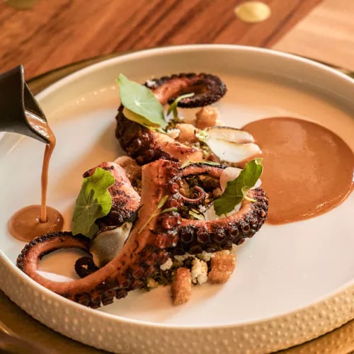 Surplombant la mer de Cortez depuis les hauteurs de Chileno Bay, Comal propose une cuisine mexicaine contemporaine puisant dans les traditions régionales du pays et les influences sud-américaines. La table, distinguée par le Michelin, excelle avec son octopus kastakan—fines rondelles de poulpe accompagnées de poitrine de porc croustillante et tortillas à la banane plantain. Pierre brute et bois sombre composent le décor; un brasero face à l'océan prolonge la soirée.
