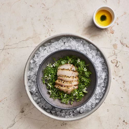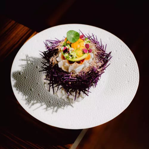 Depuis la salle du Cape Hotel, Manta offre une vue saisissante sur les formations rocheuses de Lands End. Sous la direction d'Enrique Olvera, la cuisine mexicaine contemporaine s'enrichit d'accents péruviens et japonais : ceviches vivifiés au leche de tigre, tacos de poisson tempura, patate douce laquée tamarin-soja nappée de mole aux amandes. Une table audacieuse, résolument épicée.