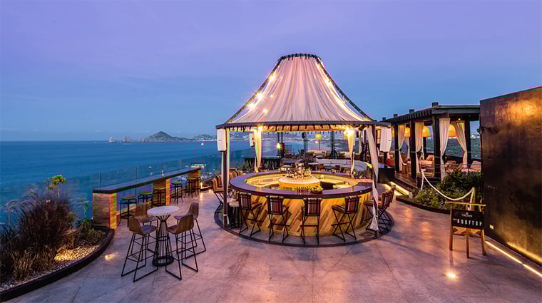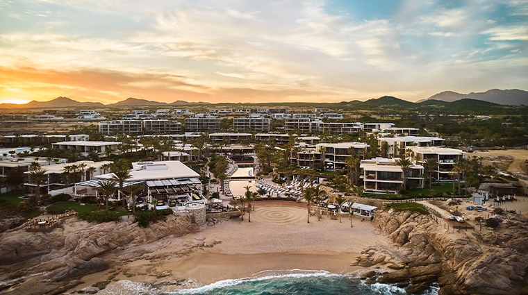 Face aux formations granitiques vieilles de trente millions d'années et au spot de surf de Monuments Beach, cet établissement de 159 chambres conjugue influences californiennes et mexicaines des années 1960 — murs en bois, têtes de lit en cuir, baignoires à fond de cuivre. Le chef Enrique Olvera y signe Manta, sa première table à Los Cabos, tandis que le Rooftop, premier bar sur toit de Cabo, attire les noctambules face à Land's End.