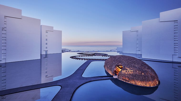 Taillé dans une colline de vingt acres surplombant la mer de Cortez, ce domaine de 115 chambres réparties en 42 pavillons offre à chaque résident piscine privée, terrasse et majordome attitré. Le Spa Alkemia déploie sur 2 800 mètres carrés une végétation luxuriante, des soins sur tapis de pierres précieuses et des salles de sonothérapie. Le soir, la façade métallique ajourée du bar Candil s'illumine au-dessus des dégustations de mezcal, tandis qu'une plage étonnamment préservée invite aux promenades solitaires à l'aube.
