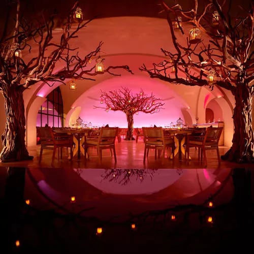Sous les branches ornées de lanternes diffusant une lumière ambrée, la terrasse en pierre polie accueille des tables en bois blond massif dans un décor oscillant entre intérieur et extérieur. La carte puise dans les traditions indiennes—le masala de poisson à la Pendjabi, nappé d'une sauce tomate aux noix de cajou—tout en s'ouvrant aux grillades au charbon et aux inspirations asiatiques qui élargissent l'horizon gustatif.