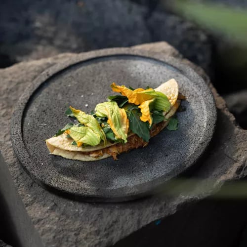 Dans une structure de verre dressée sur le domaine viticole de Lomita, la cheffe Sheyla Alvarado compose des menus dégustation où le végétal domine, couronnés d'une étoile Michelin et d'une Étoile Verte. Les produits de la ferme maison se transforment en créations audacieuses — sope de maïs bleu, purée de carotte, crevettes fumées, bougainvillier. Quelques places au comptoir révèlent la précision du ballet en cuisine ouverte.