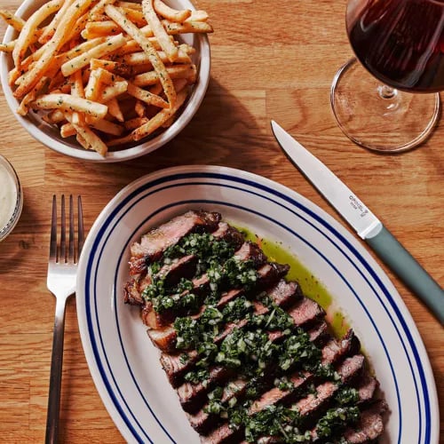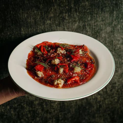 Une cave à vins occupe l'entrée, chaque bouteille pouvant être débouchée sur place ou emportée, avant de passer à table face à la cuisine semi-ouverte. La carte, volontairement resserrée, privilégie les produits locaux : rigatoni façonnés à la main, pesto au basilic, boulettes de viande et champignons black king, ou encore un steak posé sur riz Carolina Gold, pois rouges, okra et glacé de tomate fumée. Le dessert TB&J—beurre de tahini noir et confiture de fraise entre tranches de gâteau au beurre noisette—clôt le repas avec une inventivité discrète.