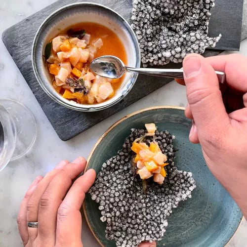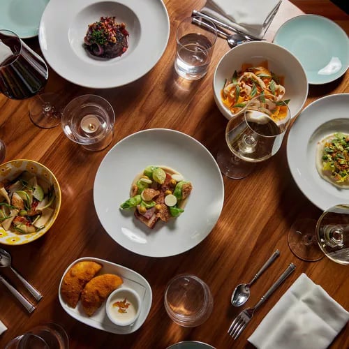 Moëca décline une cuisine italienne tournée vers la mer, privilégiant poissons et fruits de mer issus de filières responsables. La carte à partager révèle des accents cosmopolites — lotte frite au tamarin, thon relevé de 'nduja — tandis que les spaghetti au homard du Maine incarnent une générosité toute littorale. L'éclairage tamisé et le service attentionné composent un cadre raffiné, idéal pour les dîners en tête-à-tête.