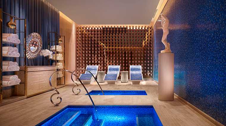 Déployé sur plus de 2 400 mètres carrés au sein du complexe Wynn, ce spa cultive une opulence théâtrale : lustres vénitiens, murs de soie peinte à la main, vestiaires gainés de cuir crocodile blanc rehaussé d'or. Dix-sept cabines proposent le rituel Good Luck, conçu pour favoriser prospérité et bien-être, ainsi que des séances de bols chantants himalayens. Les soins puisent dans les gammes Biologique Recherche, Naturopathica et Shankara.