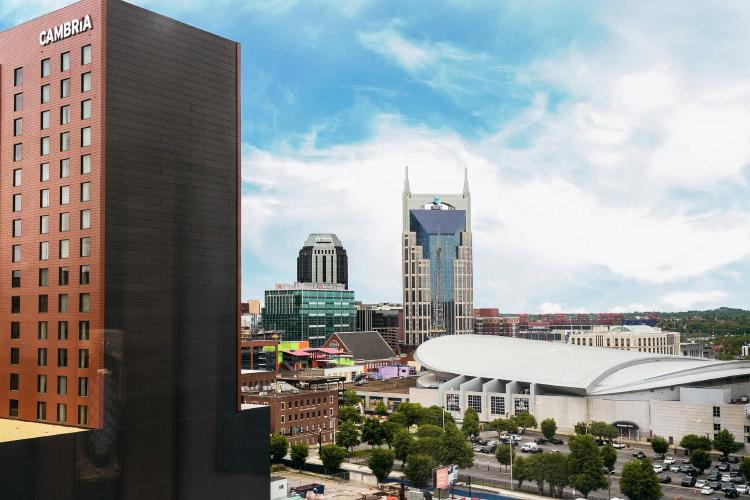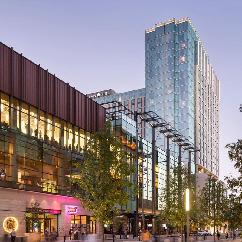 Sa silhouette ovale de verre s'élève sur 33 étages au-dessus de Nashville, habillée d'or et de bronze en hommage aux reflets de la rivière Cumberland. Au sommet, le Bourbon Steak de Michael Mina règne sur la ville depuis le plus haut restaurant-terrasse de la métropole. Les 1 100 mètres carrés de piscine avec cabanas privées accueillent les voyageurs toute l'année, tandis que le Stompin' Grounds Market séduit avec ses gelati artisanaux au Maker's Mark.