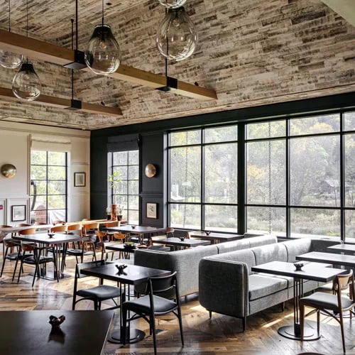 Sur le domaine de 325 acres de Southall Farm, les chefs Andrew Klamar et Nate Leonard orchestrent une cuisine authentiquement fermière—serres, vergers, rucher de quatre millions d'abeilles et atelier de conserves alimentent leurs assiettes. La carte célèbre la lenteur : côte de bœuf braisée 48 heures sous vide, puis grillée, nappée d'un curry vert soyeux. De vastes baies vitrées révèlent l'origine pastorale de chaque plat.