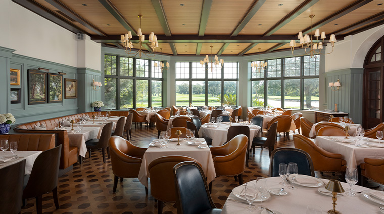 Derrière les boiseries d'acajou et les banquettes bordeaux, les baies vitrées dévoilent le dix-huitième trou du Plantation Course. Cette table de viandes maturées propose des découpes de premier choix avec préparation en salle, accompagnées d'une limonade au bourbon Woodford créé spécialement pour le domaine. Au crépuscule, un cornemuseur traverse le parcours de golf—spectacle à contempler depuis la véranda avant de passer à table.