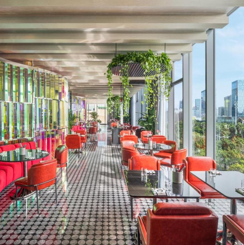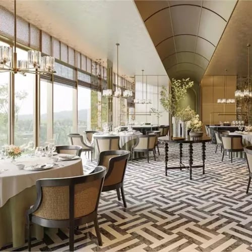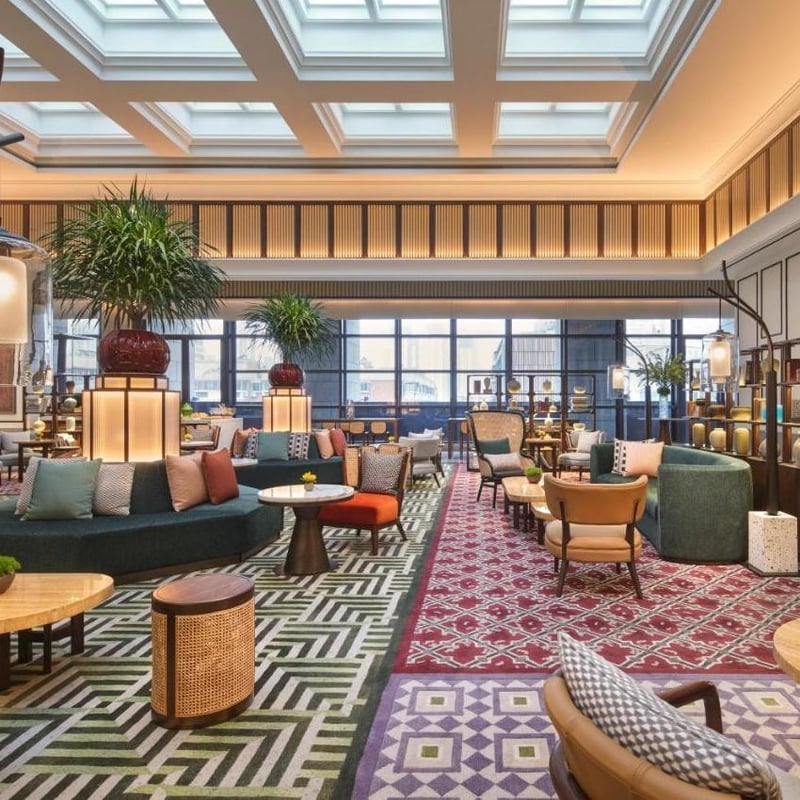 Dominant la frondaison du parc Lianhua, cette tour signée AB Concept déploie un vocabulaire botanique à travers des volumes à double hauteur baignés de lumière. La terrasse du cinquième étage, avec jardins, piscine et cabanas, constitue un refuge urbain raffiné. Au Peacock Alley, des écrans métalliques en forme de plumes évoquent l'artisanat chinois. Les chambres déclinent deux palettes : bleu côtier ou tons terreux inspirés du thé local.