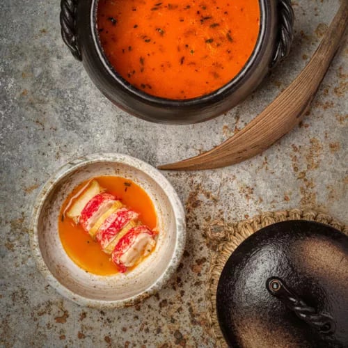 Le chef argentin Agustin Balbi signe à Xiamen sa première adresse dans le Fujian, un espace aux jeux d'ombre et de lumière oscillant entre modernité et classicisme. Son menu dégustation marie ingrédients locaux et techniques européennes et japonaises : tartare de thon coiffé d'un caviar de dix ans d'âge, écume de paprika, riz soufflé. Le caldoso, généreux et réconfortant, rend hommage à la cuisine de sa grand-mère.