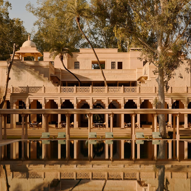 Sur les anciennes terres de chasse du Maharaja d'Alwar, Amanbagh ressuscite la splendeur moghole à travers les dômes roses et les pavillons de grès signés Ed Tuttle. Quinze villas privées disposent de piscines personnelles et de baignoires en marbre. Un programme détox conçu avec Novak Djokovic associe médecine ayurvédique et méditation, tandis que les dîners aux lanternes sous les chhatris ancestraux célèbrent les produits du jardin bio.