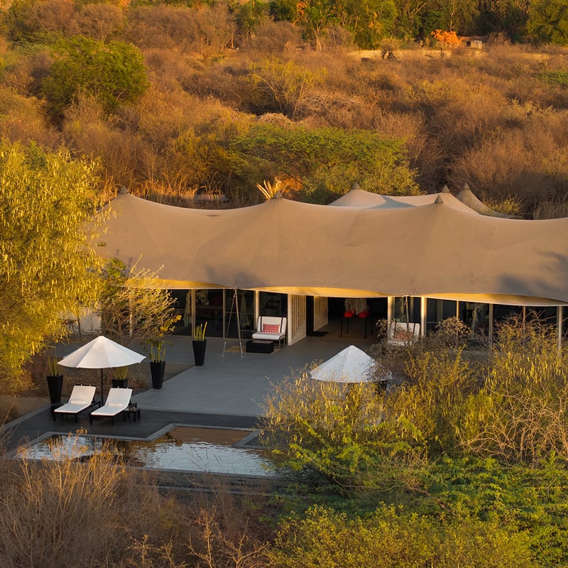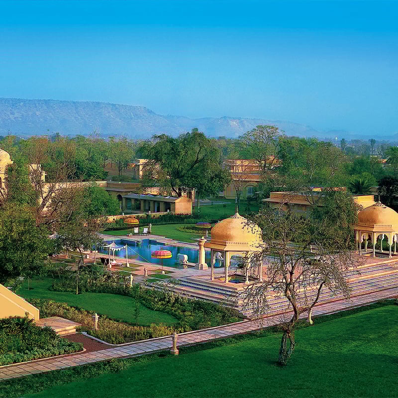 À trois heures et demie de Jaipur, ce campement de luxe aux portes de Ranthambore déploie 25 suites sous toile de 73 mètres carrés, habillées de teck, de mobilier colonial et de baignoires sur pieds. Bassins de nénuphars et jardins soignés s'ouvrent sur un fort du dixième siècle. Chaque soir, le fondateur du parc Fateh Singh évoque l'écologie des tigres, tandis que le bar-bibliothèque affiche fresques et décors de pavillon de chasse princier.